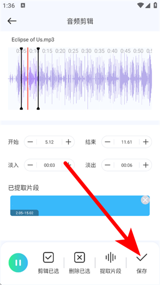 4、确认剪辑效果后,点击底部的保存,完成音频剪辑操作。