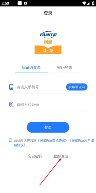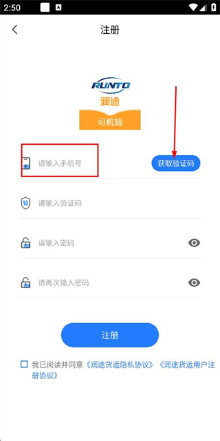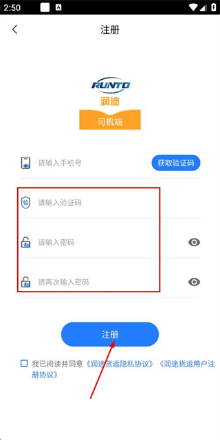 3、在注册账号页面填写验证码和密码,勾选协议后点击注册完成注册操作。