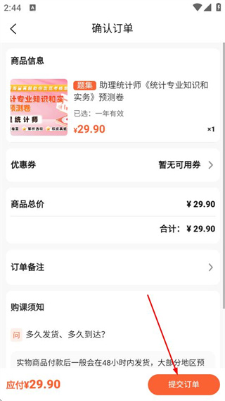 4、在订单页面,确认信息后点击提交订单按钮即可完成试卷购买。