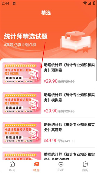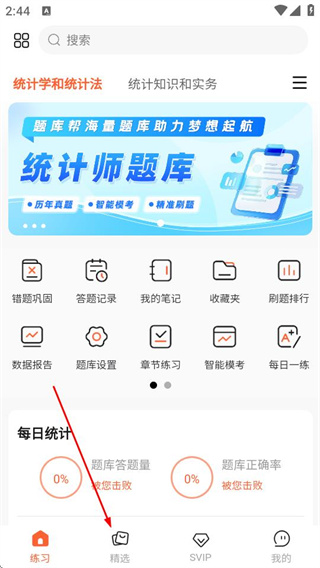 1、进入练习页面后,点击底部的精选选项,可进入精选试题页面。