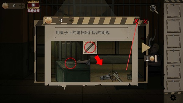 1、在该监狱逃脱场景中,根据提示在场景中拾取道具,点击桌子下掉落的笔,拾取场景内的道具以推进逃脱进程。