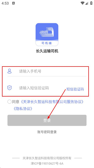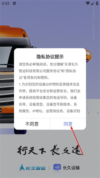 1、阅读天津长久智运科技有限公司服务协议和隐私协议后,点击同意。