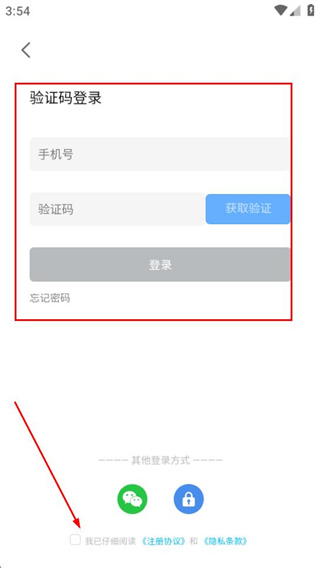 3、在登录页面,勾选协议后填写信息,即可完成账号登录。