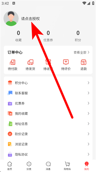 2、在个人页面,点击请点击授权区域,进入登录页面。