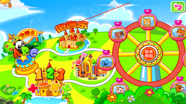 1、进入儿童宝宝幼儿园游戏界面,可选择拖拖乐等模块进行学习,遇到问题可点击摩天轮处的联系帮助获取协助。