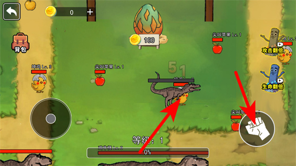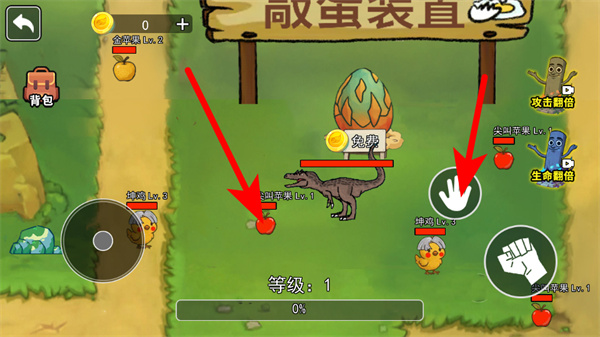 4、遇到恐龙敌人时,点击右侧拳头按钮发起攻击,利用已有的宠物配合战斗,击败敌人推进等级进度。
