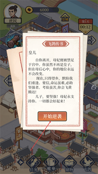 1、点击界面中的开始逆袭按钮正式开启征程,明确初期以庶民身份低调蛰伏的核心定位,为后续行动划定基础方向。