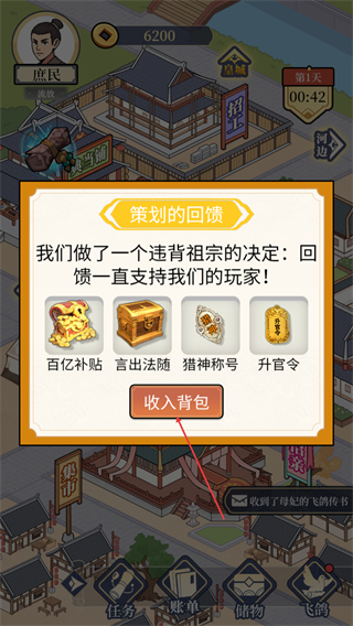 2、遇到策划的回馈弹窗时,点击收入背包领取全部道具,其中百亿补贴可补充初期启动资金,言出法随提供战斗增益。
