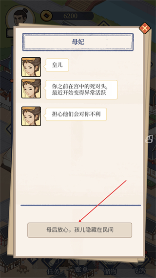 3、在母妃提及宫中死对头异常活跃的传书界面,选择母后放心,孩儿隐藏在民间的回复,同时需牢记死对头信息以规避后续针对。
