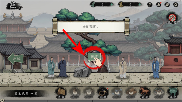 2、游戏中依照箭头指引,点击场景里的传道按钮,完成该交互操作,以此推进游戏的初始流程。