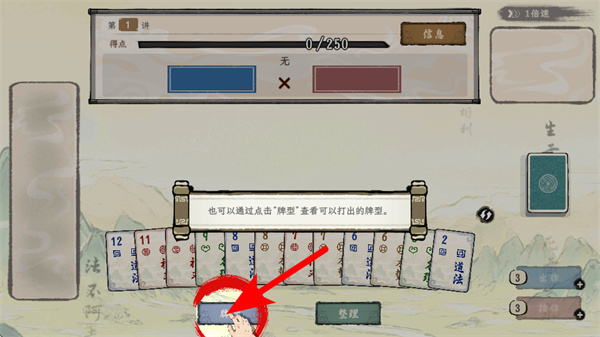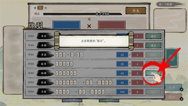 4、按箭头指引操作,点击联册对应的提示按钮,获取牌型相关的玩法提示,助力熟悉游戏的机制。