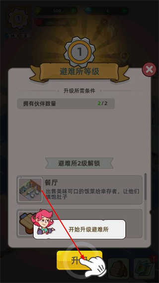 1、进入游戏主界面后,跟随界面中的指引提示,点击左上角的齿轮样式按钮,触发避难所升级的相关操作,进入避难所升级的准备界面。