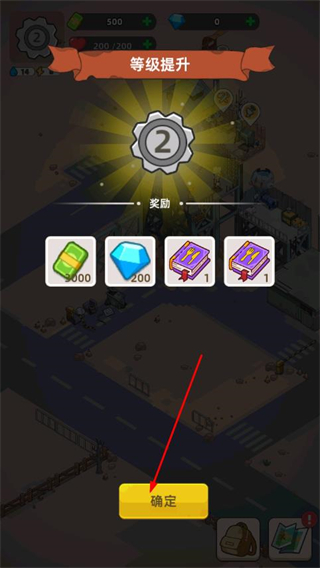 4、确认解锁设施后,界面会显示升级对应的奖励,点击确定领取奖励,利用这些资源建设新解锁的设施,通过设施为幸存者提供服务,积累资源继续提升避难所等级。