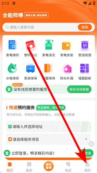 1、在全能师傅页面,点击底部我的选项,进入个人页面。