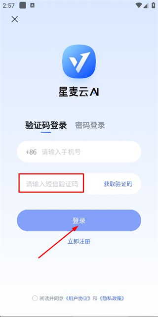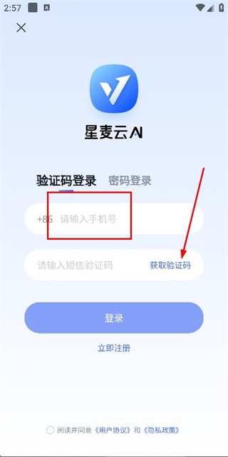 2、在登录页面填写手机号,勾选协议后,点击获取验证码。
