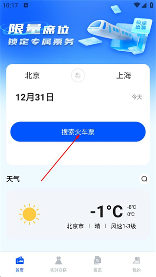 1、在首页,确认出发地北京、目的地上海及日期后,点击搜索火车票查询车次。