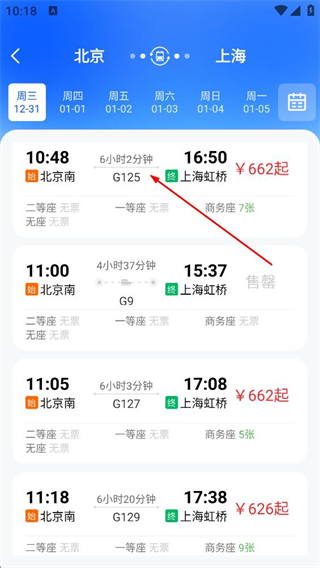 2、在火车票搜索结果页面,点击G125车次的条目,进入该车次的详情页面。