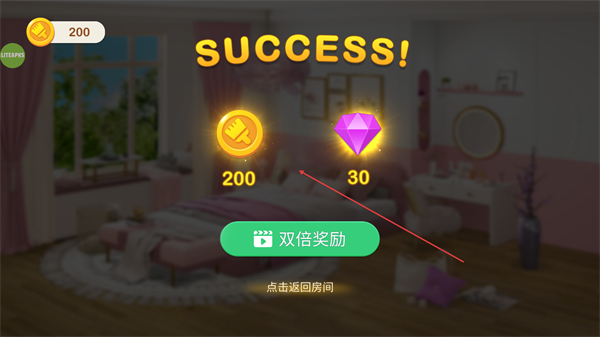 4、完成所有物品收集,触发SUCCESS,获得金币与钻石奖励,可选择返回房间。