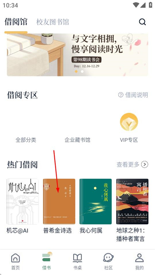 2、在借阅馆页面,点击目标图书,可进入该图书的信息页面。
