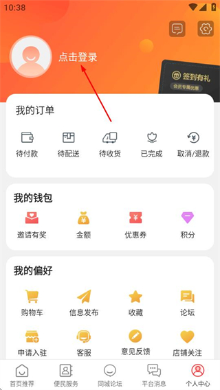 2、在个人中心页面,点击点击登录区域,可进入登录页面。
