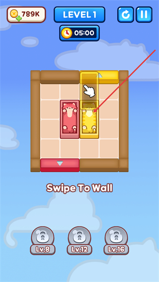 2、当前处于游戏界面显示SwipeToWall提示,你需按指引滑动对应区域来移动猫咪方块,完成关卡内的匹配操作。