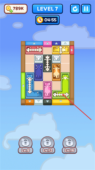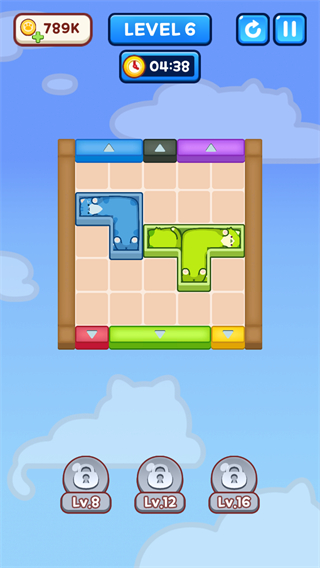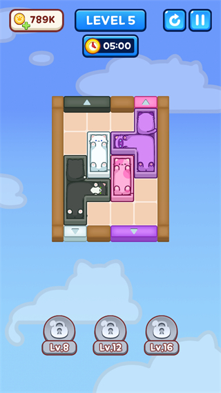 关卡设计围绕逻辑规划展开,需统筹方块移动顺序、猫咪行进路线与颜色匹配需求,同时规避迷宫陷阱。每次闯关都是对逻辑思维与空间规划能力的锻炼,兼具娱乐性与益智性。