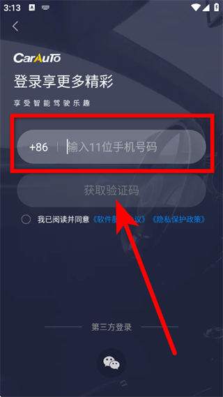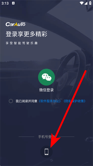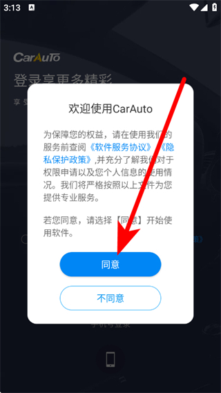 1、打开CarAuto,在弹窗中,点击同意按钮,进入登录选择页面。