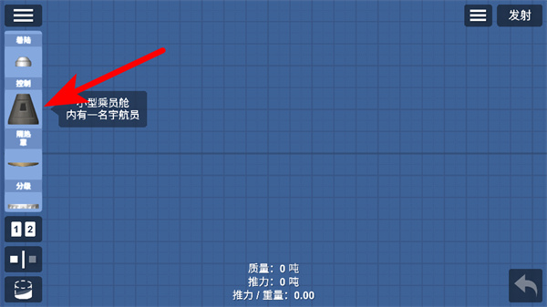 1、进入游戏界面后,点击左侧的舱体组件如微型乘员舱,这是组装火箭的关键操作,准确点击才能将组件添加到设计区。