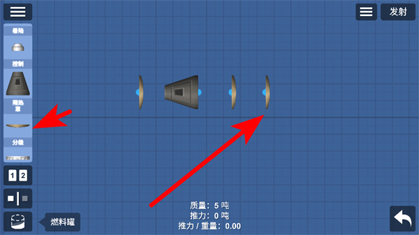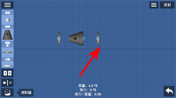 4、按箭头指引,添加燃料罐等组件优化火箭配置,调整推力与质量的比例,为后续发射做好准备。