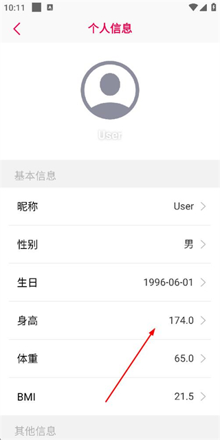 3、在个人信息页面点击身高选项,弹出身高数值调整的窗口。