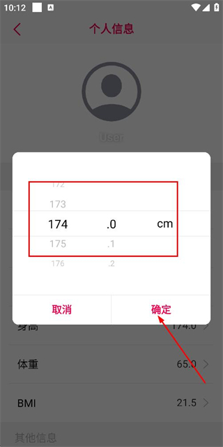 4、在身高调整窗口选择目标数值后,点击确定按钮完成身高信息的修改。