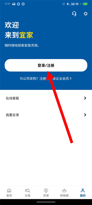 2、在个人页面,点击登录注册,进入宜家的登录注册页面。