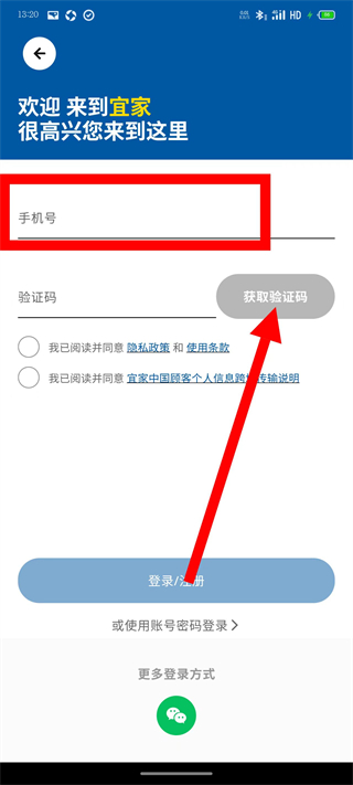 3、在登录注册页面,输入手机号,点击获取验证码。
