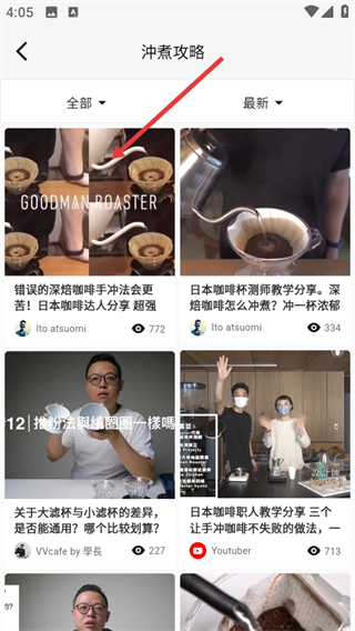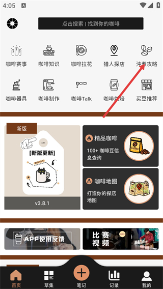 1、进入首页后,点击冲煮攻略选项,可进入冲煮攻略的内容列表页面。