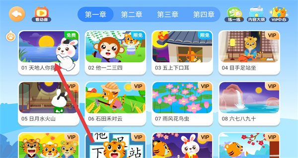 1、在章节选择页,点击目标文章卡片,进入对应的识字训练页面,选定待练习的内容。