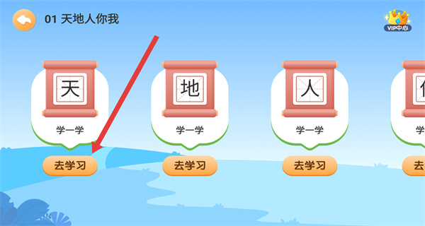 2、进入文章的汉字学习界面后,点击去学习按钮,开启“天”“汉字的认知学习环节。
