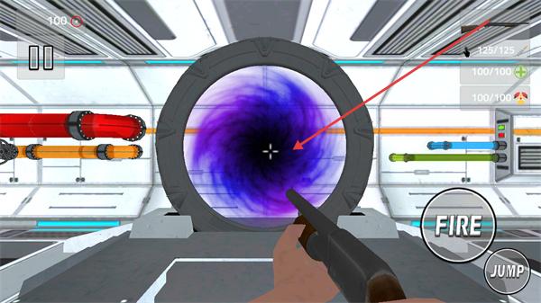 1、瞄准紫色漩涡区域,点击FIRE键触发互动,开启传送类场景推进关卡。