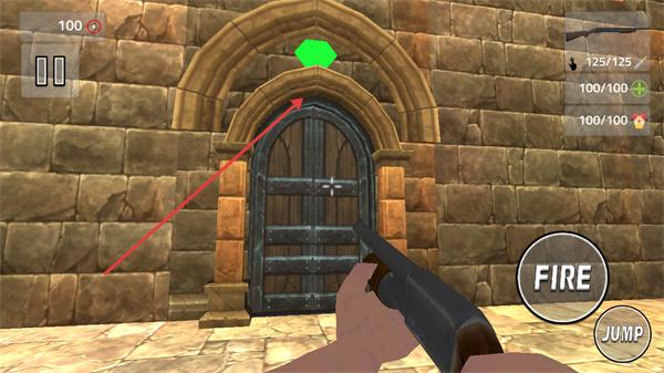2、瞄准门上方绿色标识,点击FIRE键解锁,靠近后门会自动开启进入新区域。
