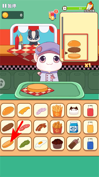 2、根据订单需求如汉堡,点击对应的食材如面包片,将其添加到托盘上,逐步组装食物。