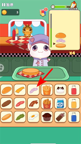 3、继续点击订单所需的其他食材如薯条,添加到托盘,完成当前菜品的制作,获取金币奖励。