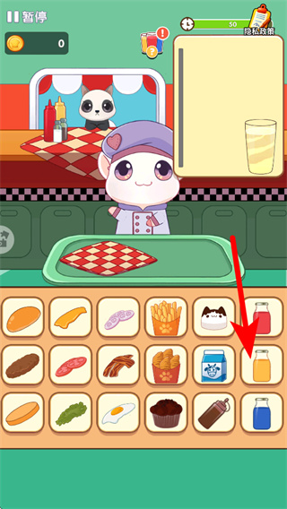 4、当订单需求为饮品时,点击对应的饮料如橙汁,将其添加到托盘,完成饮品制作,推进进度。