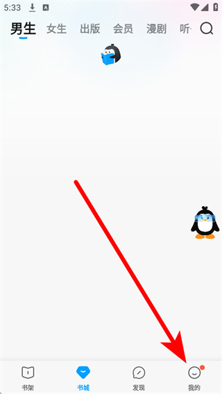 2、在书城页面点击底部导航栏的我的选项,进入个人中心页面。