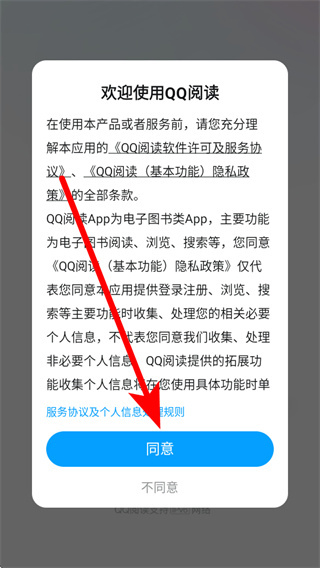 1、打开QQ阅读,弹出协议弹窗后,点击同意,进入书城页面。