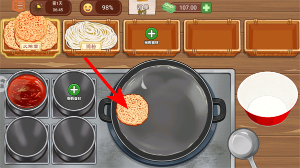 3、将所需食材如火鸡面面饼拖入锅中,完成基础食材的烹饪处理。