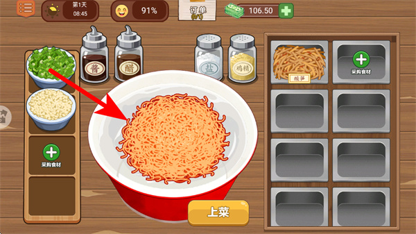4、把烹饪好的食材盛入碗中,加上配料,点击上菜按钮,即可完成订单并获取收益,推进游戏进度。