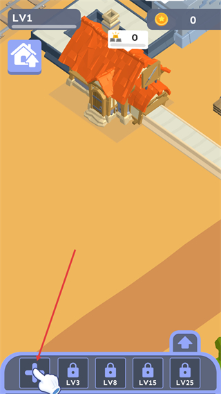 3、观察界面底部带加号的图标,按指引点击该图标,可触发对应操作以推进当前建筑相关的关卡进程。