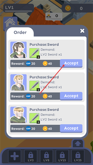 4、在Order界面中,Purchase:Sword需求为LV2Swordx1,点击对应的Accept按钮可接取订单,完成后可获取EXP20等奖励。