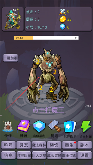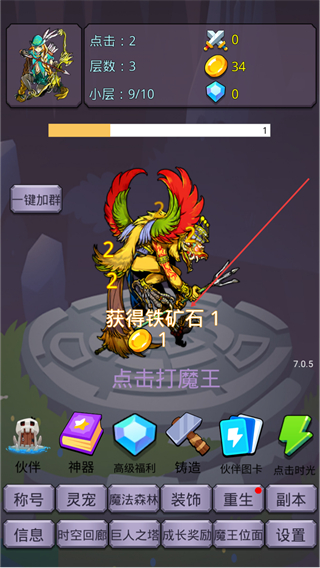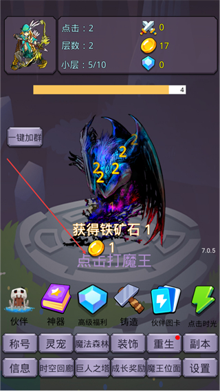 1、点击打魔王按钮攻击当前魔王,获取铁矿石与金币,提升层数进度。