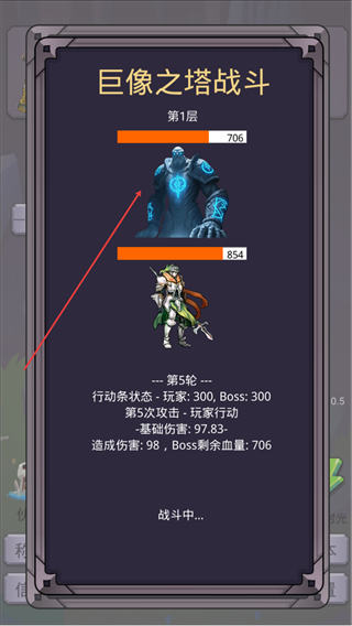 1、进入巨人之塔界面,查看勇者属性后点击挑战,进入第1层战斗。