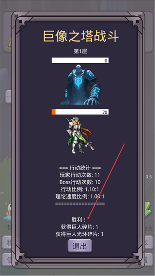 4、击败Boss后获得巨人碎片、巨人光碎环,点击退出完成本轮挑战。